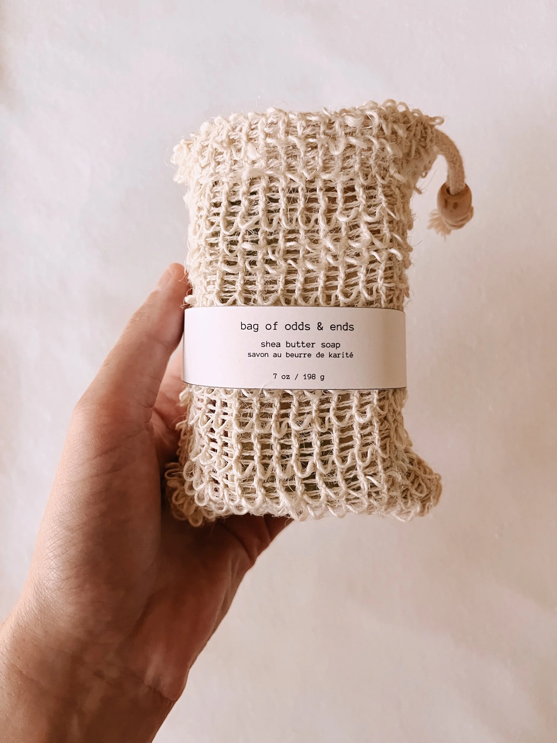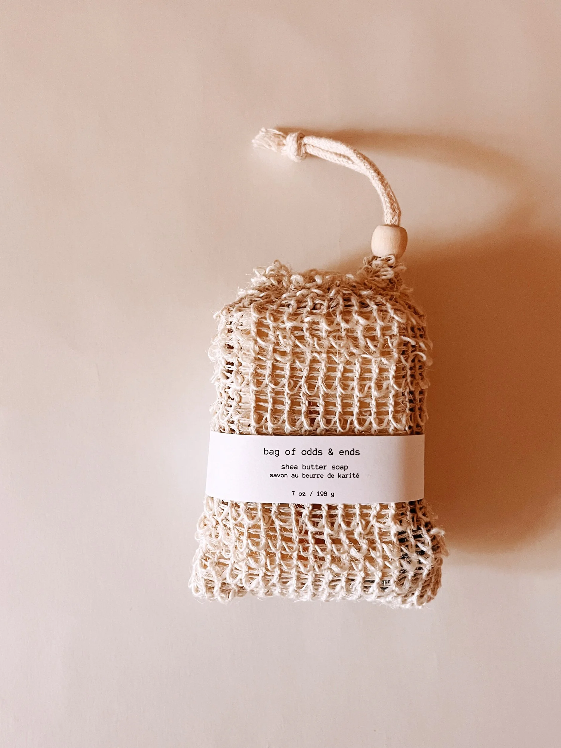 Soap can be used on its own or in this bag. Just dampen the bag and rub between hands to build lather. Sisal bags make a great skin exfoliator! Hang to dry when done using.