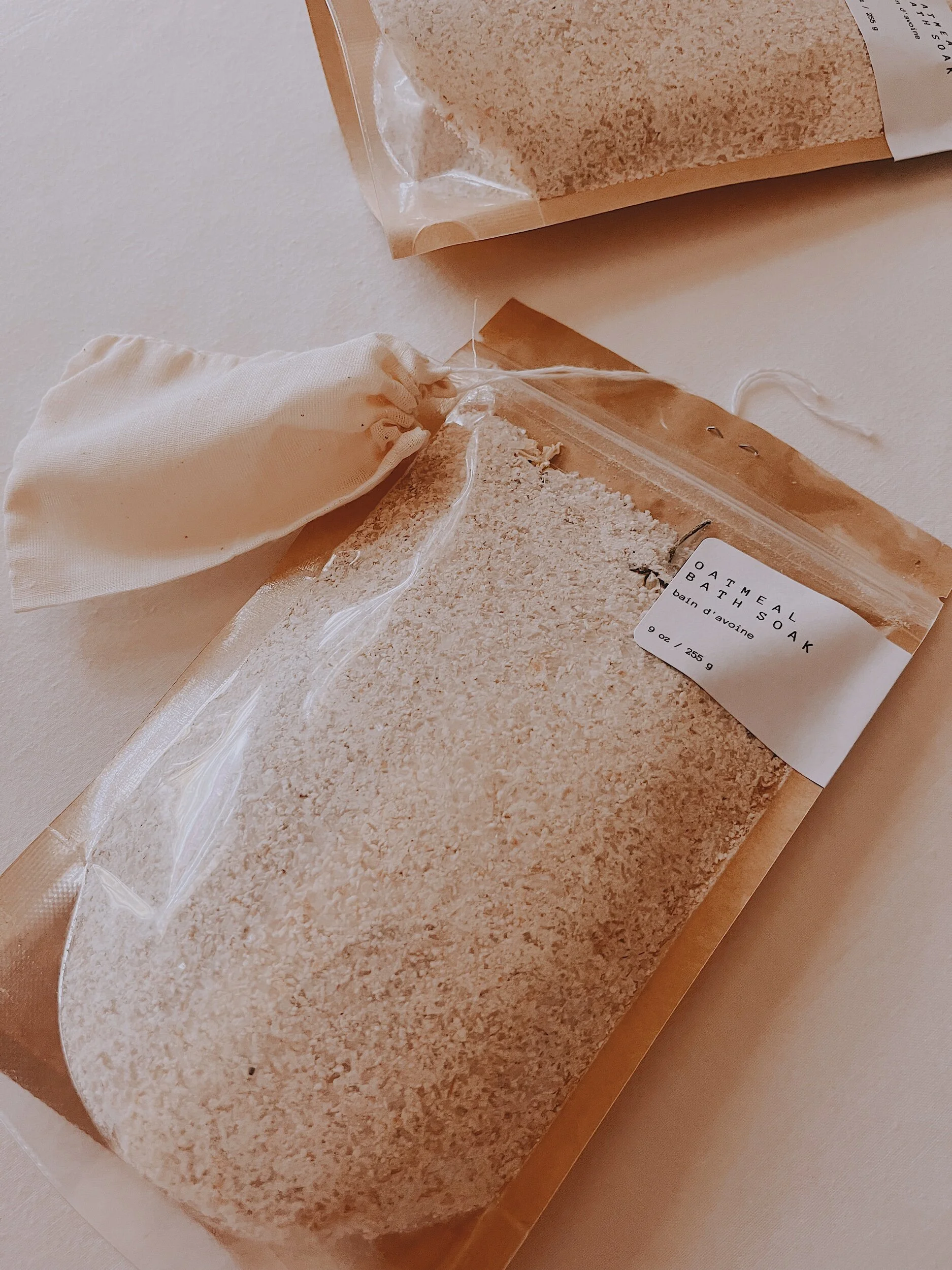 A resealable bag of bath soak with ground oats, epsom salt & sea salt.