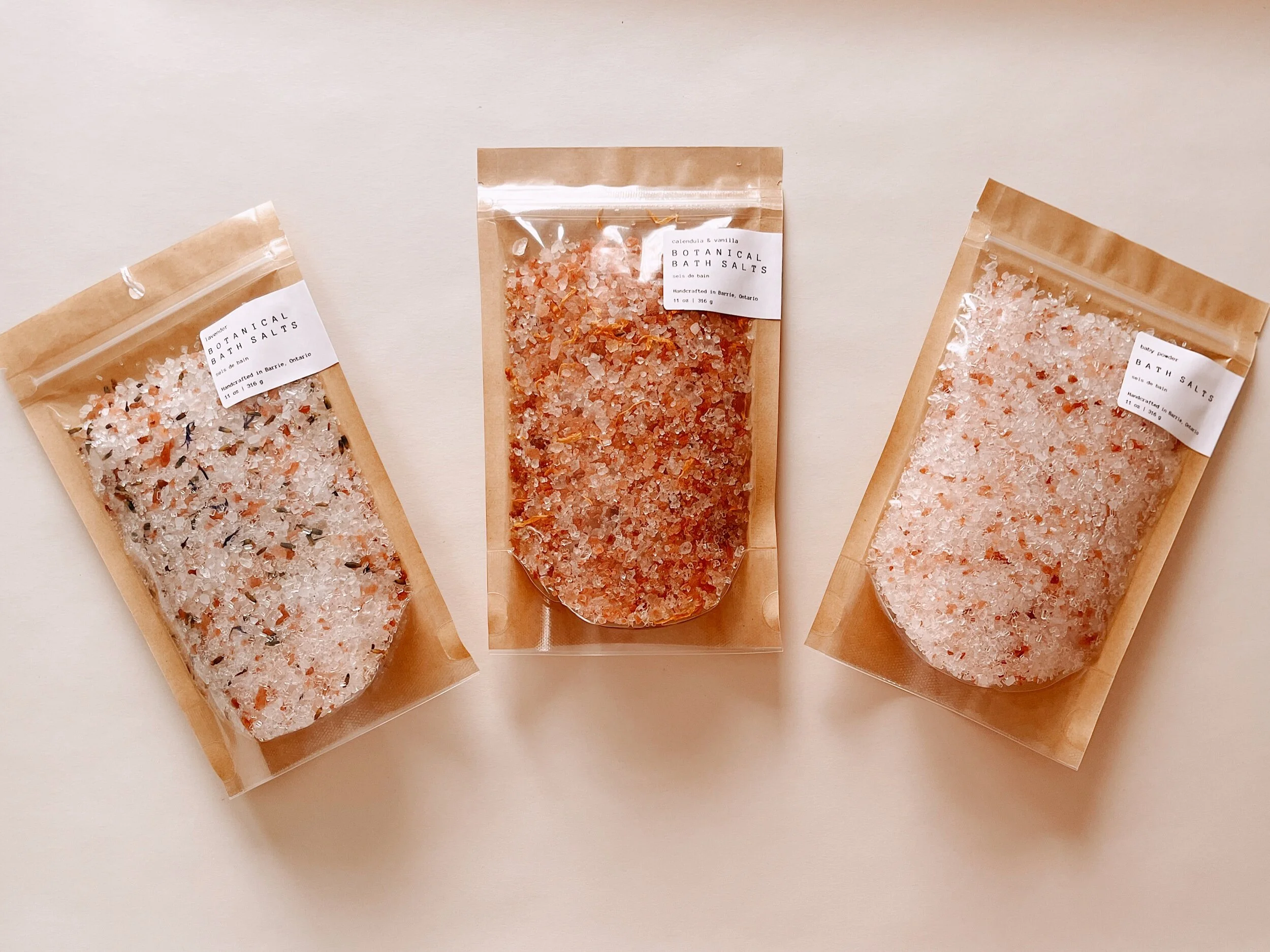 Handcrafted bath salts with skin nourishing ingredients.