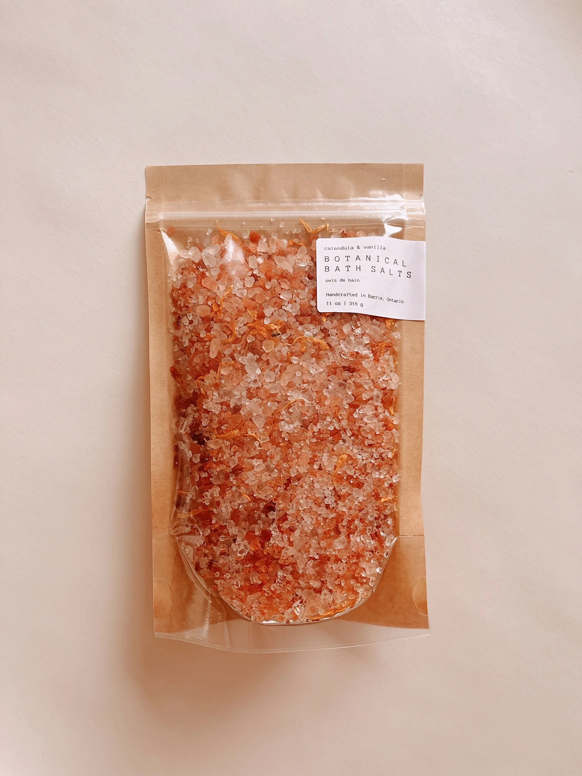Calendula & Vanilla Botanical Bath Salts - ingredients: Himalayan salt, calendula flowers, sunflower oil, fragrance oil