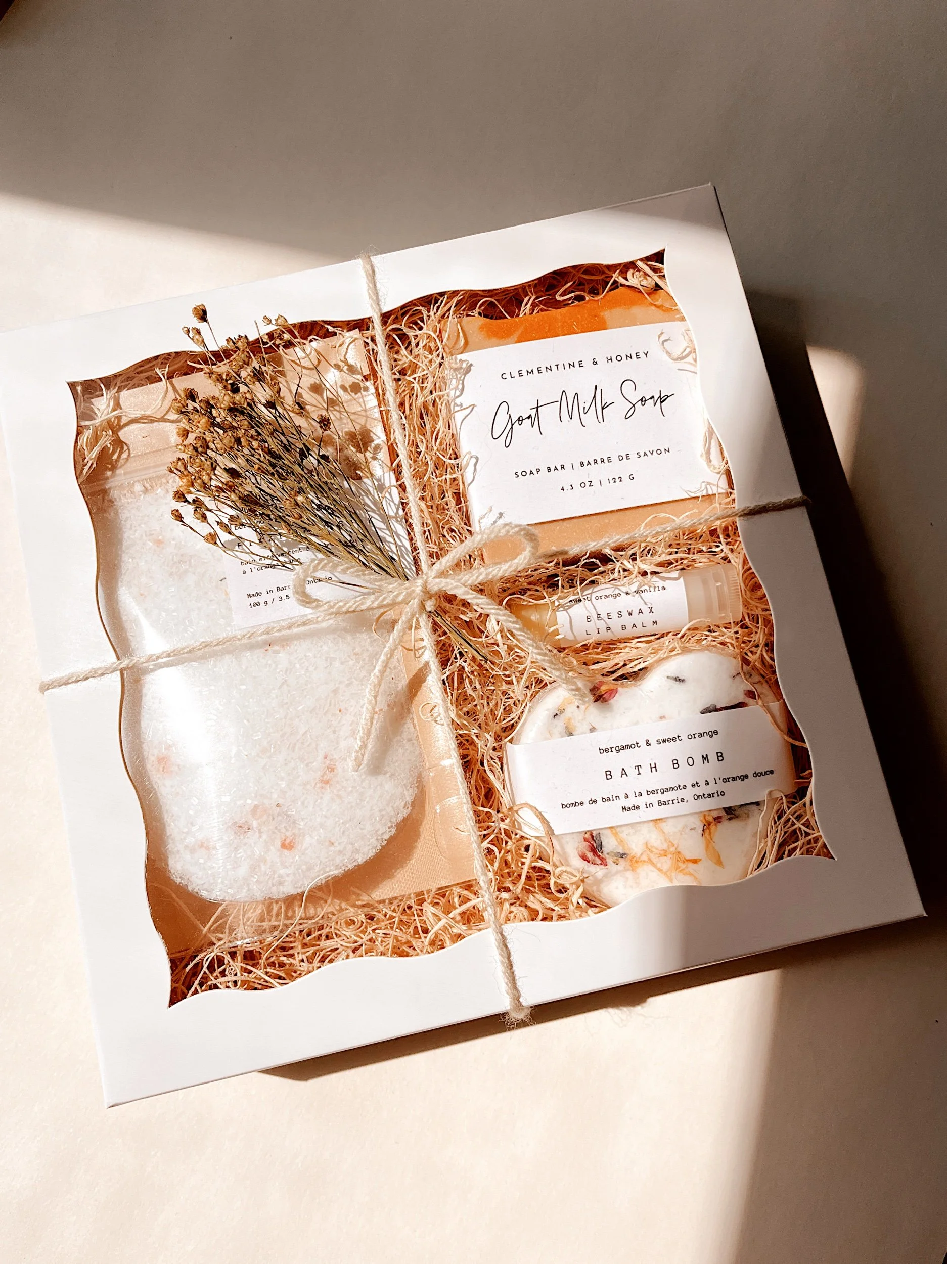 Each item is lovingly handmade, ensuring a unique and personal touch in every box. The presentation is just as special: nestled in decorative wood shred, wrapped with rustic yarn, and finished with a delicate bouquet of dried flowers for an elegant, heartfelt touch.