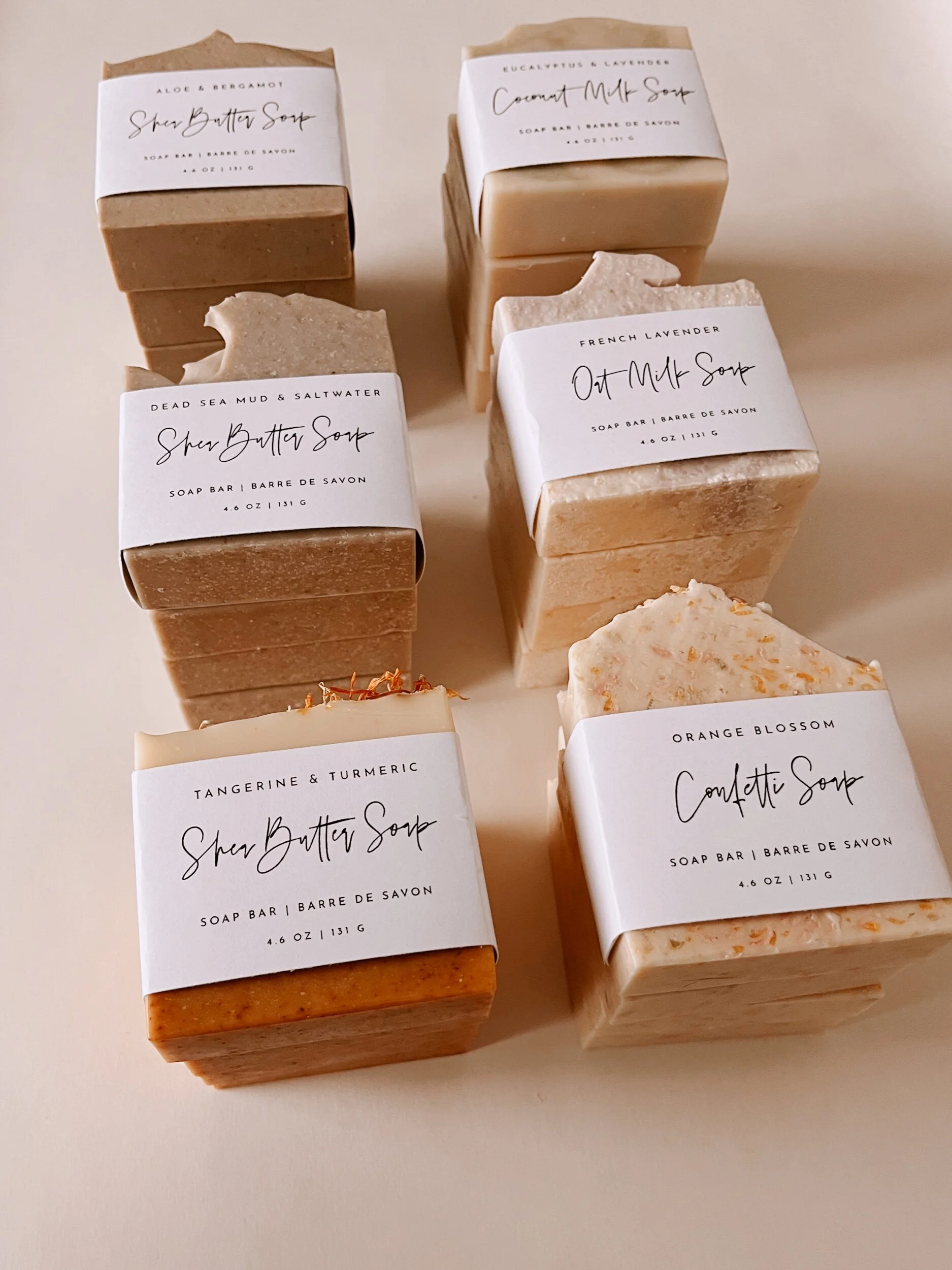 soap may contain: nut oils, bee pollen, honey, Shea butter, olive oil, coconut oil, castor oil, essential oils/fragrance oils, titanium dioxide, mica, chlorella, spirulina, natural clays, wildflowers, charcoal, Coconut milk, goat milk, aloe vera